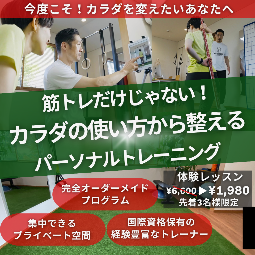 パーソナルセッションではトレーニングだけでなく、食習慣(栄養摂取)のアドバイスや休息の上手な取り方などもお伝えします。トレーニングを受けるだけでなく、生涯理想の体型をコントロール出来るコンディショニング法を身に付けれることが最大のメリットになると思います。